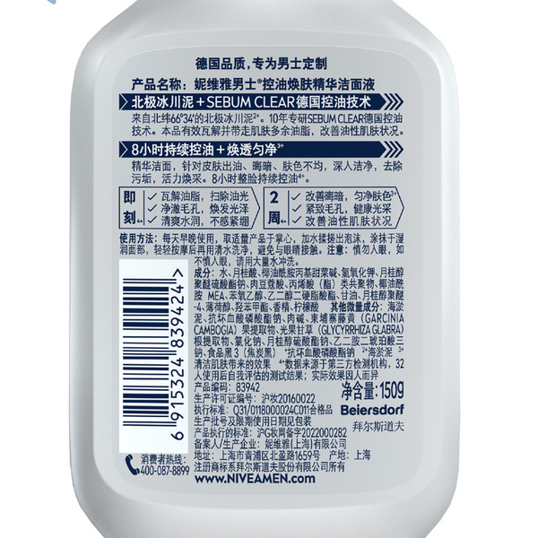 妮维雅男士控油焕肤精华洁面液深层清洁补水保湿洗面奶150g*2瓶