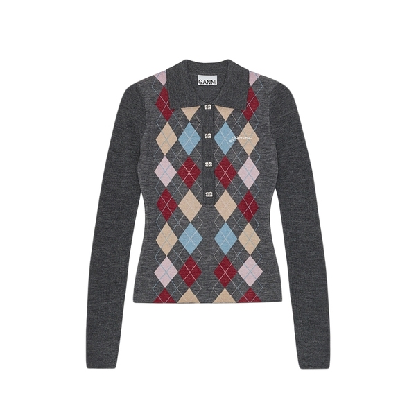 【甄选折扣】GANNI女装 撞色菱格polo领上衣内搭针织衫 K2601920