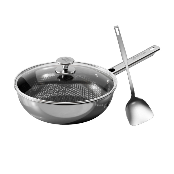 304不锈钢材质,蜂窝纹理设计,炒菜不粘又省油,简直是厨房神器。电磁炉、燃气灶都能用,一锅多用超方便