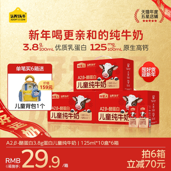 漏‼️认养一头牛哞星人A2β酪蛋白125ml儿童奶,74.9元得3箱装(30盒),149元得6箱装(60盒),拍6箱的选项送价值59元小书包!超级划算【新日期】