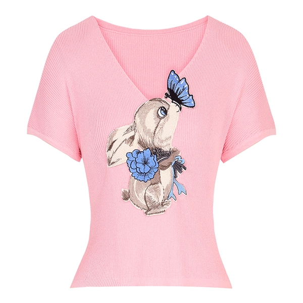 妖精的口袋白色贴布绣v领短袖针织衫女2026夏季新款修身显瘦上衣
