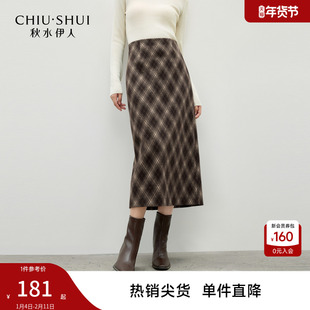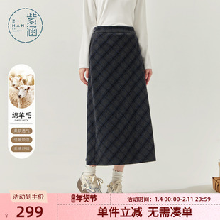 紫涵羊毛灰格半身裙女2025年冬季新款复古高腰后开叉修身直筒裙子